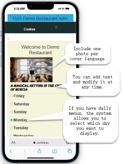 • You can add a text below the photo and modify it at any time (this text can be in 4 languages, for example, 'This Saturday we have anchovies').