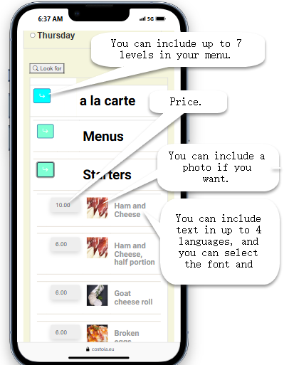 • Your menu can be structured up to 7 levels. Example: 1) À la carte, 2) Drinks, 3) Beers, 4) Beer A (see demo restaurant).