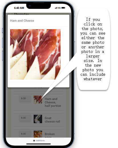 • Even when the customer clicks on the photo, it will show a more detailed image of the dish, where you can include ingredients or special suggestions.