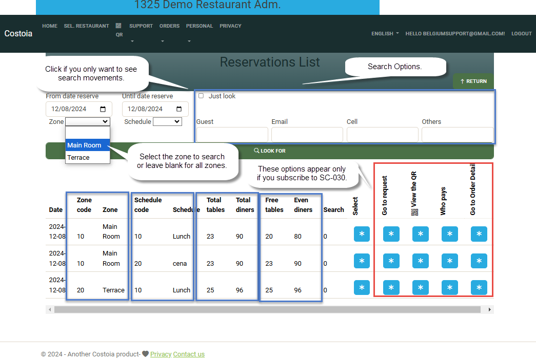 • You can search for a reservation by name, email, or phone number, and it will show you where that reservation is located.