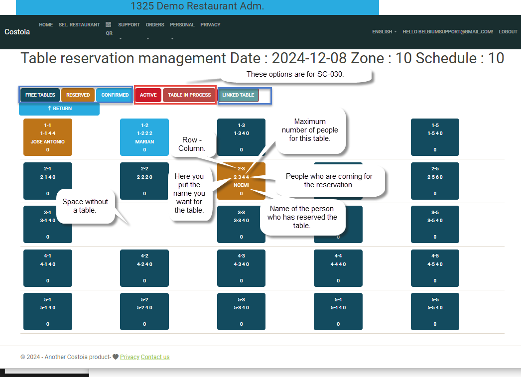 • For each reserved table, you can indicate the status: reserved, confirmed, etc.